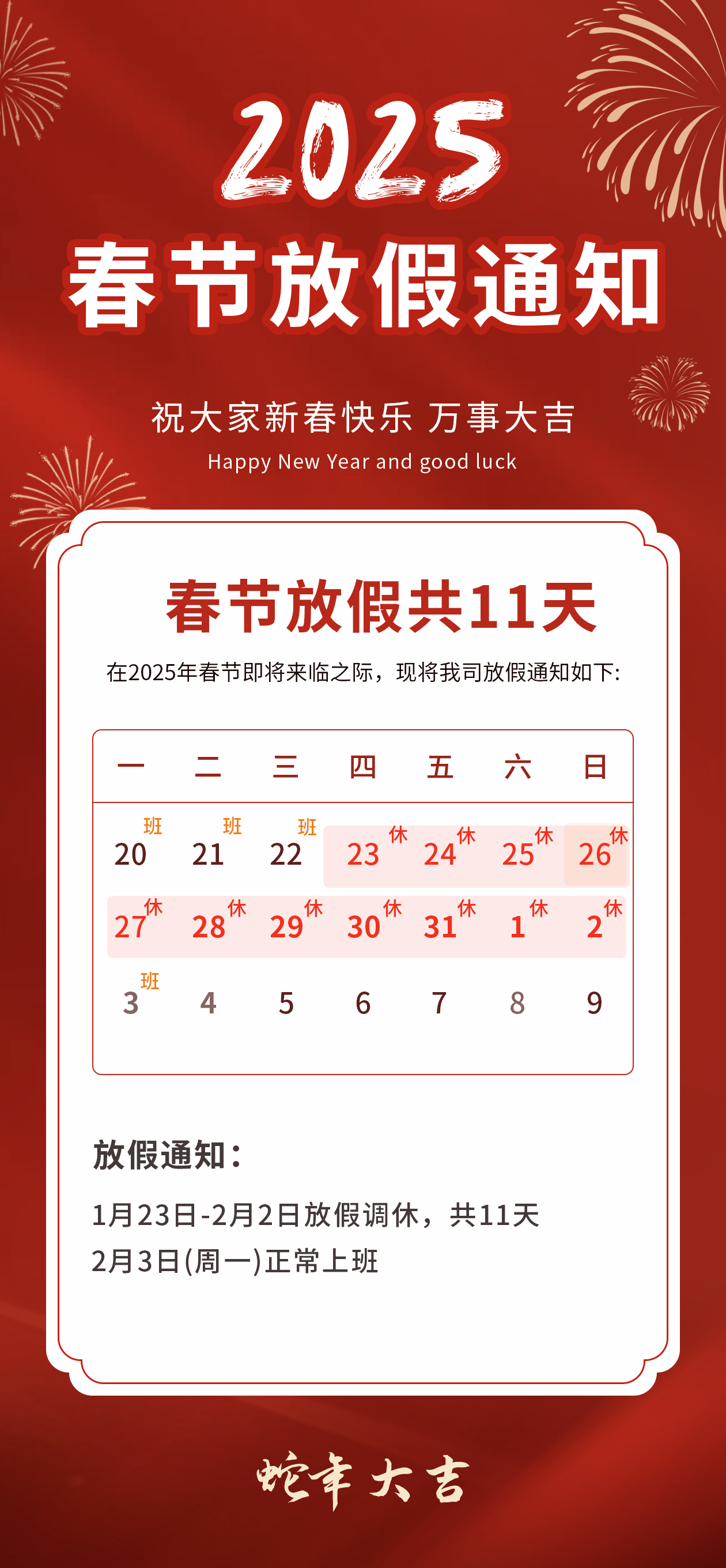 為了讓公司員工過一個(gè)歡樂祥和的春節(jié),將對春節(jié)假日提前和延長,現(xiàn)將公司春節(jié)放假時(shí)間通知如下:2025年1月23日(農(nóng)歷臘月二十四)~2025年2月2日(農(nóng)歷正月初五)(共計(jì)11天),2月3日(農(nóng)歷正月初六)正式上班。